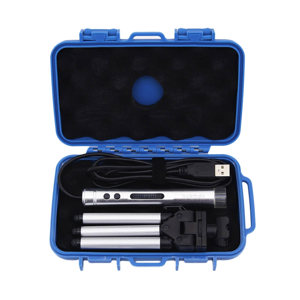 Supereyes B010 — многофункциональный микроскоп с кнопочной фокусировкой, плавной регулировкой кратности и видеодатчиком CMOS с разрешением матрицы 2 Мп. Диаметр устройства - 19 мм, длина составляет 125 мм, по внешнему виду напоминает шариковую ручку. Механические и оптические элементы сосредоточены в одном корпусе. Максимальное увеличение – 300х. Прибор оснащен регулируемой светодиодной подсветкой с автоматическим балансом яркости и белого цвета. Есть функция моментального снимка, записи видео, измерения дуги, периметра и расстояния.